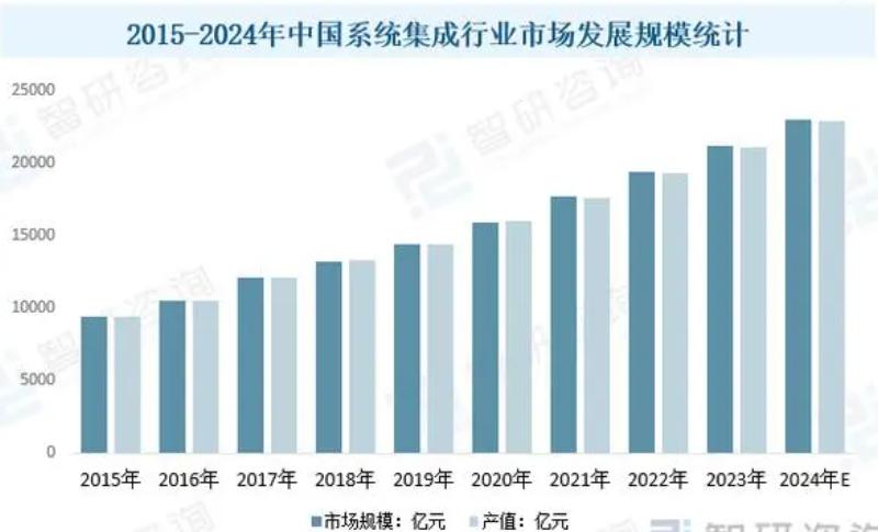系统集成技术覆盖的范围比较广,如软硬件集成、数据集成、网络集成和安全集成等;应用于航空器设计、通讯技术、工业制造、交通、能源等多个领域。从全球系统集成市场来看,我国是全球亚太市场的核心区域,系统集成正处于新的高速发展期,预计 2024 年全球系统集成市场规模将达 11949.2 亿美元,我国系统集成市场规模将达 22973 亿元,行业产值将达到 22941 亿元。
