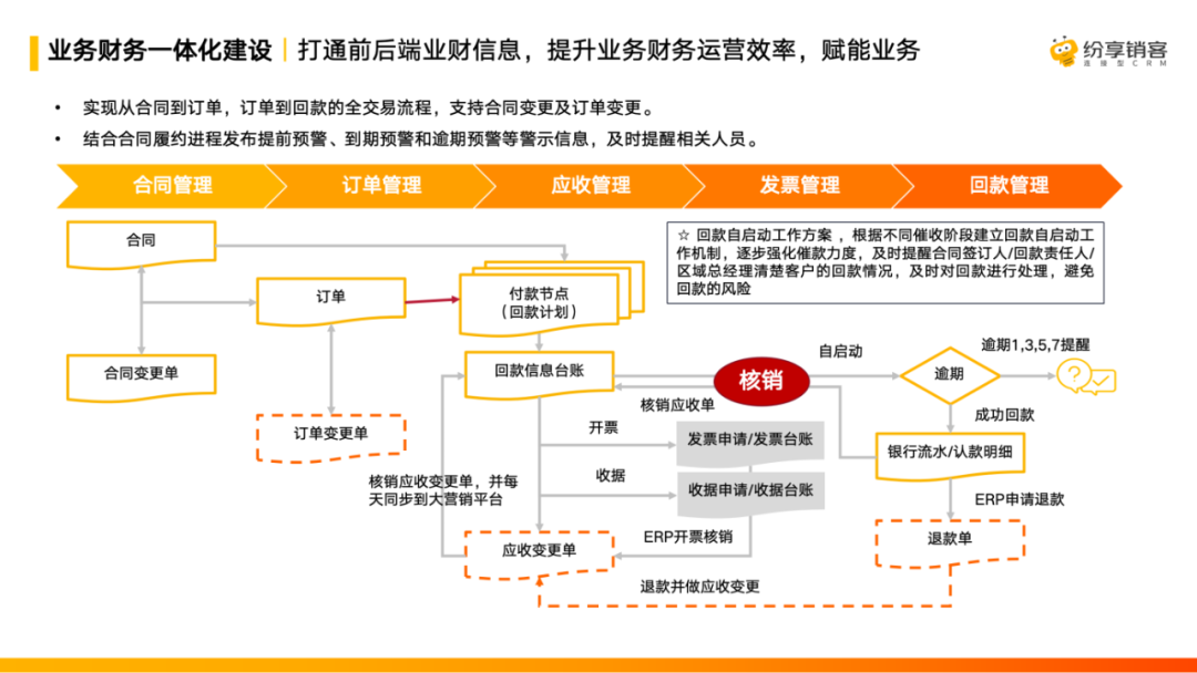 在日常工作中,业务和财务“相爱相杀”的戏码不时上演,销售频繁追问财务客户打款进度,财务也需要线下核对业务数据,两个部门的割裂严重影响前后端的协作效率。 ERP统管供应、生产、物流、采购等模块,是大多数企业尤其是制造业、外销型企业的标配系统。对于已有ERP的企业而言,打通CRM和ERP系统可以形成从需求段到供给段的完整闭环,实现从合同到订单,订单到回款的全交易流程数字化管理。比如合同或订单可以同步变更,合同履约进程提前发布预警并提醒相关人员等。 CRM和ERP组成最佳搭档,在前端可以助力业务及时掌握回款、发货等信息,在后端可以赋能供应链根据销售预测合理排产,实现业务财务一体化。 业务财务协同能大幅提升整体运营效率,促进前后端业务流、信息流和数据流的交互融合,提升后端对前端的支撑和响应能力,助力企业及时应对复杂的业务变化。
