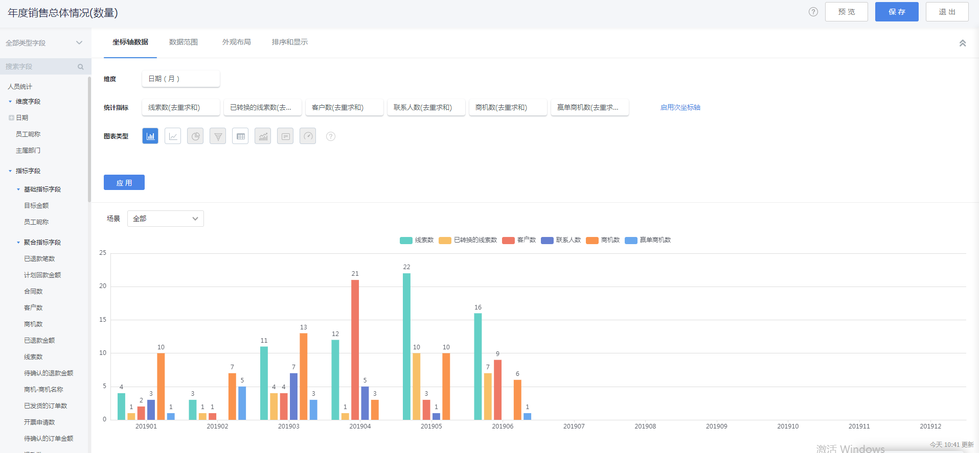 统计本年度内每个月的线索数、已转换线索数、客户数、联系人数、商机数、商机赢单数的总和。