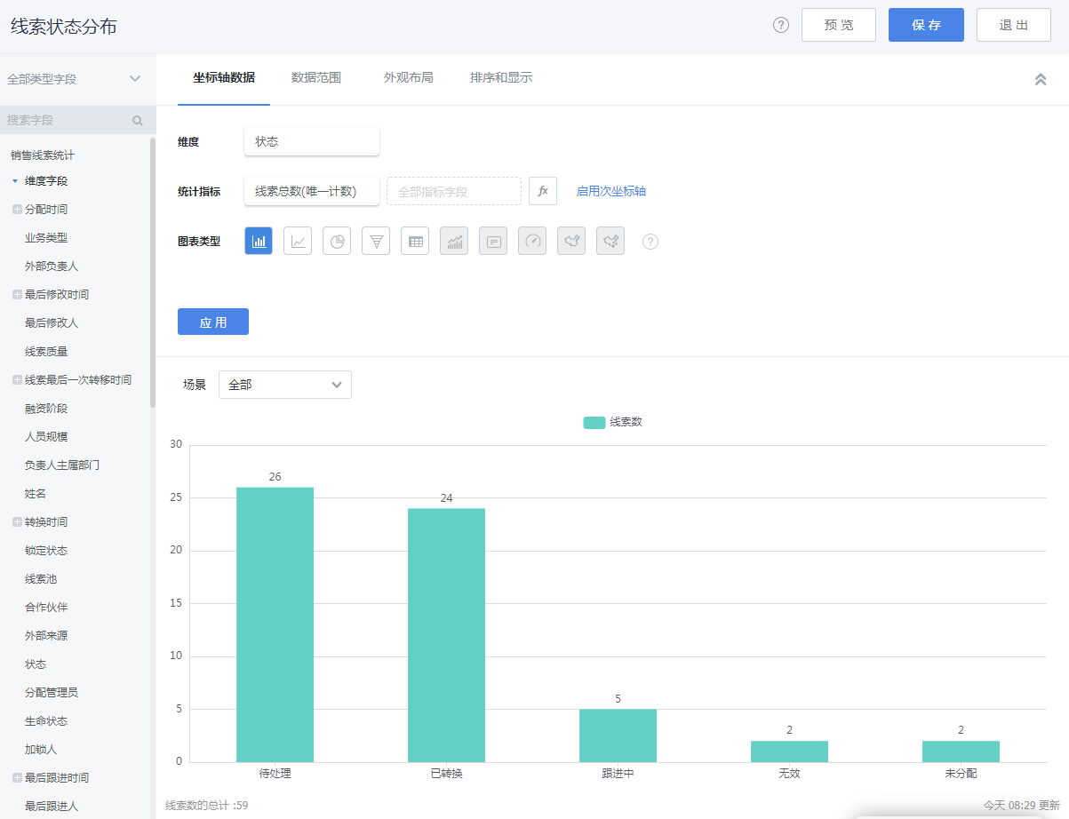 该模板能用柱形图显示本年度中不同的线索状态下的线索数量分布情况。当用户需要了解线索各个状态的数量时,可以使用该模板。