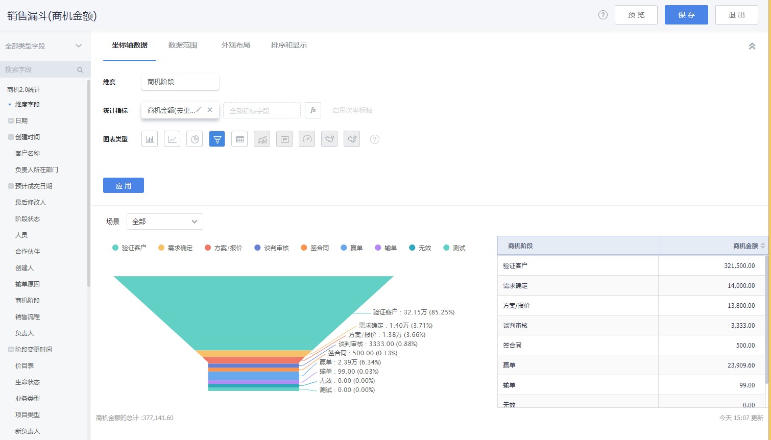对商机当前所处阶段的商机金额进行求和统计。通过销售漏斗,可以很好的了解公司商机的跟进情况,掌握公司商机在各阶段的分布。