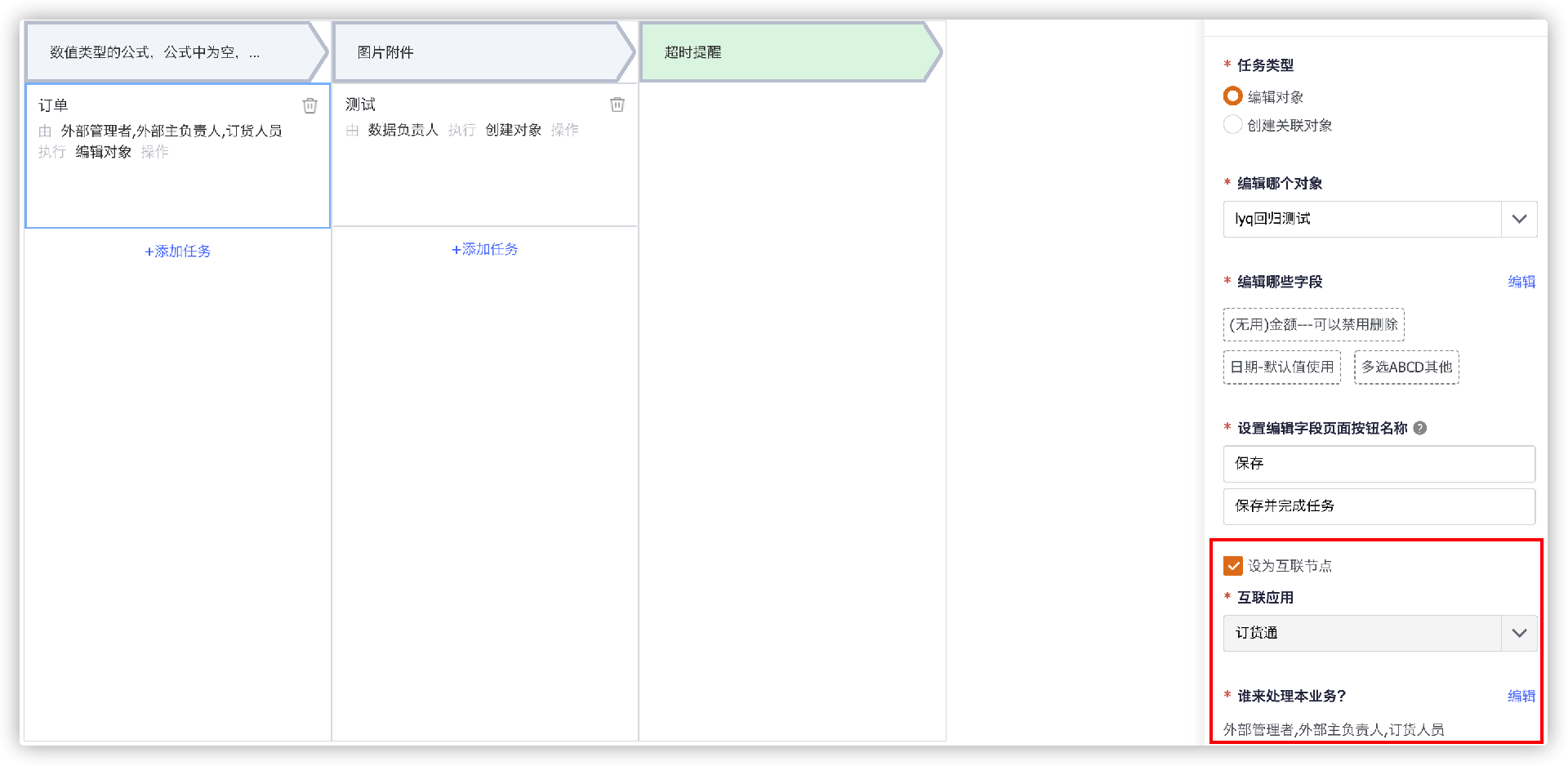 谁来处理本业务:可在此互联节点,添加下游企业人员变量;