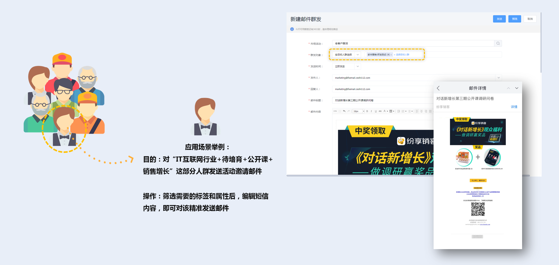 支持企业通过邮件营销向潜在客户群发个性化内容对潜在客户进行客户培育转化;